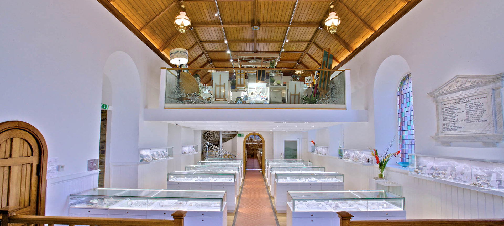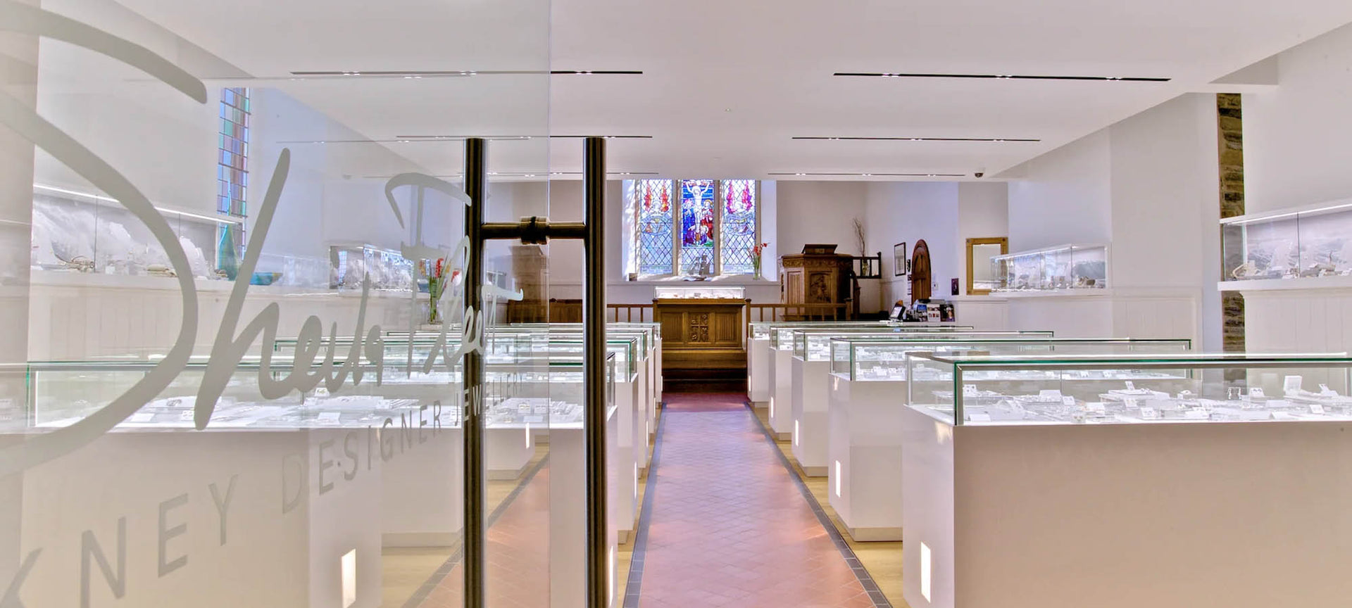 Glance upwards and you’ll see the original brass lamps that once lit church services, now shining on Sheila’s silver, gold and platinum designs below.