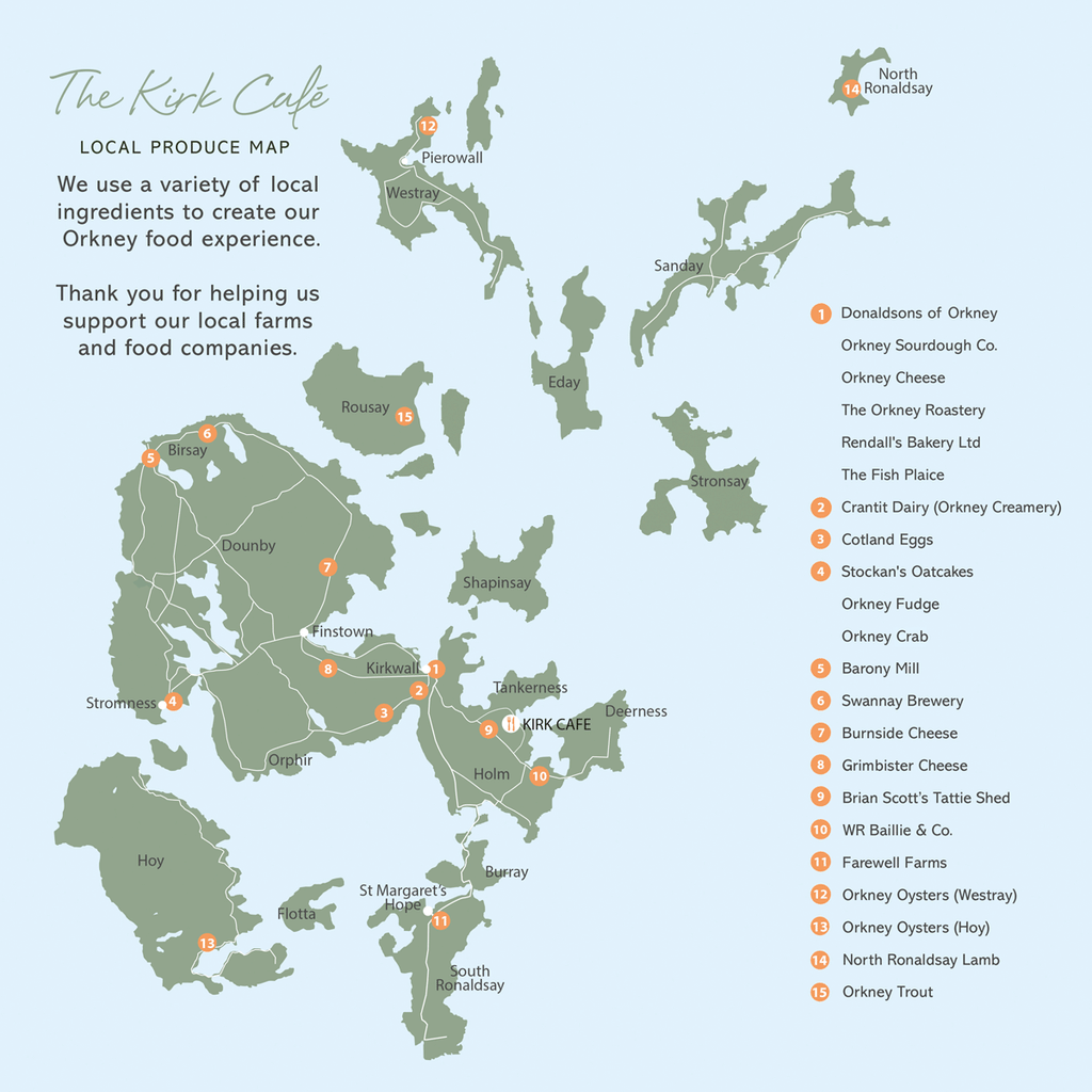 "We use a variety of local ingredients to create our Orkney food experience at The Kirk Café. Take a look at our Local Suppliers page to find out more about the various companies, farms and small businesses involved.